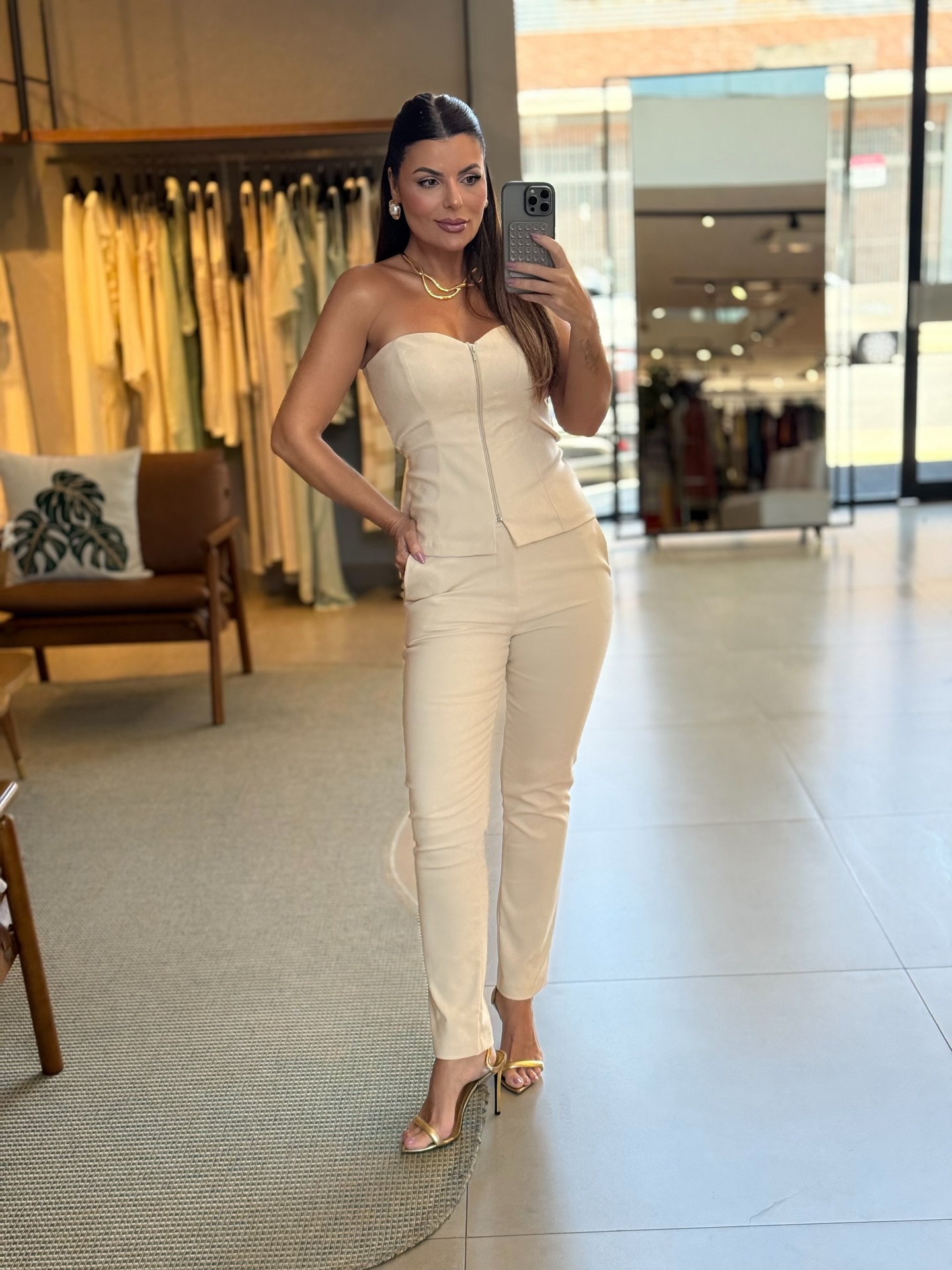 Conjunto comporto por calça reta , bolso faca , fechamento em zíper com botões.